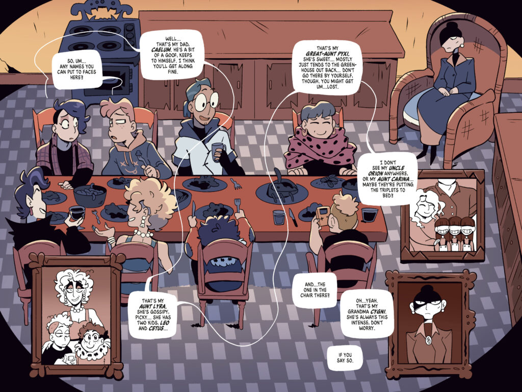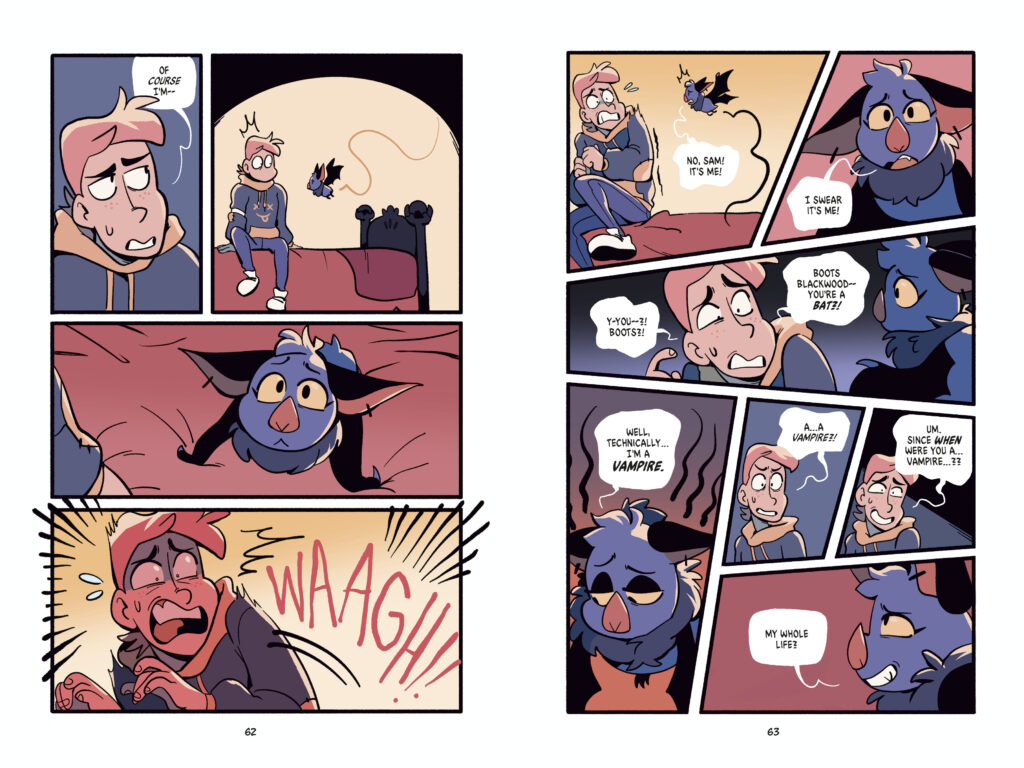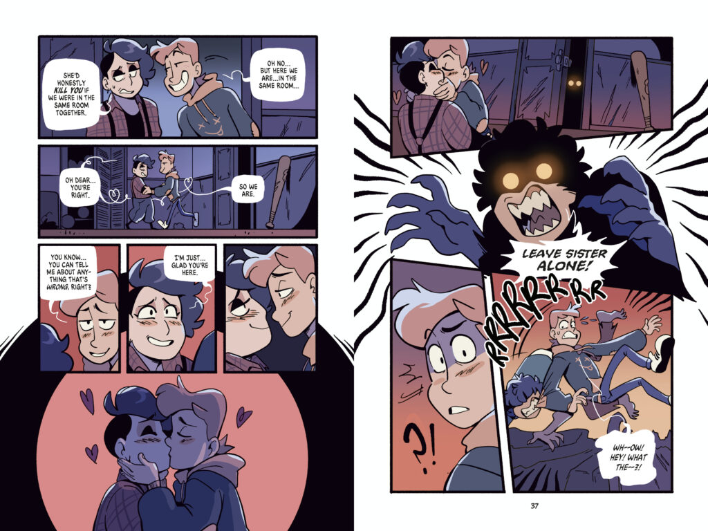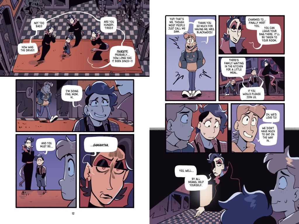 Fangs and All is a YA graphic novel following Sam and Boots, as they visit Boots’s family for the first time in their relationship… and discover some monstrous secrets about them, and themselves.